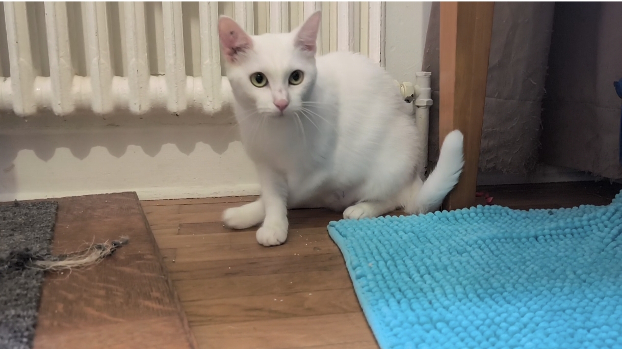 Maintenant qu’elle a confiance, c’est un amour, elle ronronne et vient chercher les câlins.  Par contre  se méfier, quand on lui donne sa pâtée, ayant sûrement endurée la faim, on peut se prendre quelques coup de pâte.  C’est  pour ça  que je conseille d’éviter les enfants en bas âge.