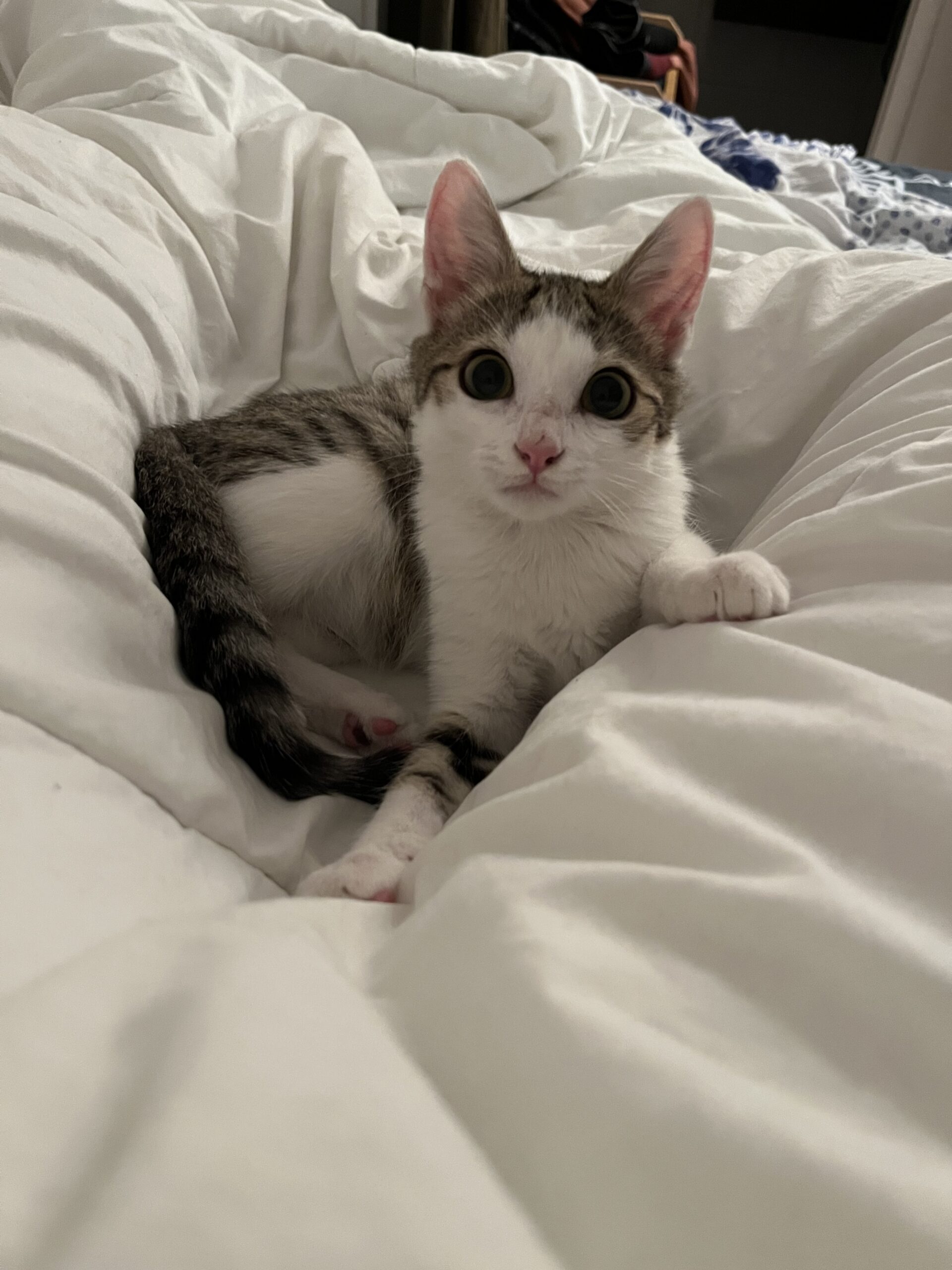 Canaille est un beau mâle blanc et tigré d’environ 6 mois.