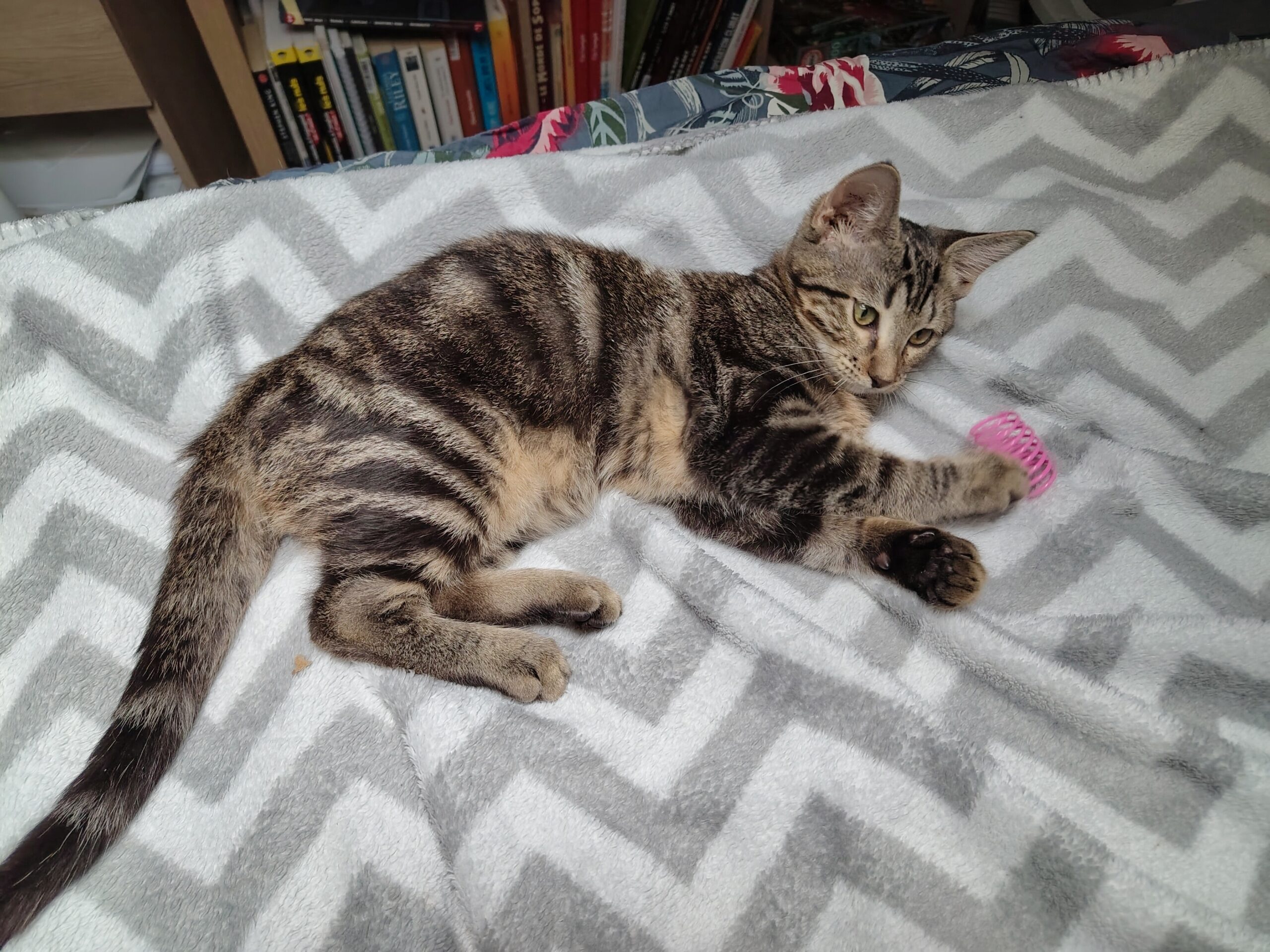 J’ai été trouvé et heureusement mis à l’abri du froid car j’étais tout petit et craintif. Maintenant Je suis un petit chaton qui découvre tout, aime tout voir, joue énormément et avec tous. Du jouet chat à un bouchon, au chouchou cheveux. Tous et un jouer pour moi et j’adore jouer.