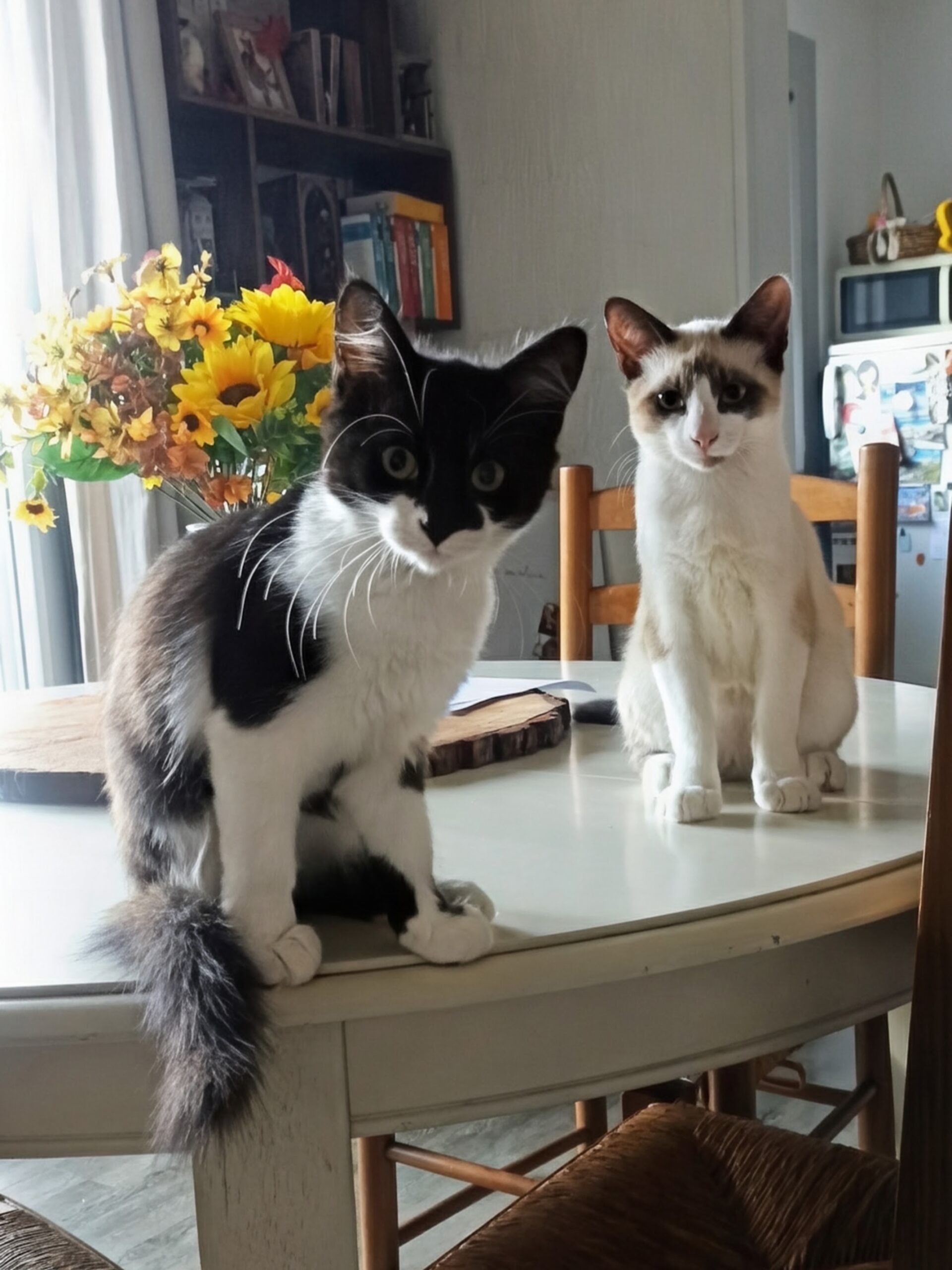 Elle s’entend très bien avec les autres chats, adultes comme chatons, avec qui elle aime jouer et faire des câlins.