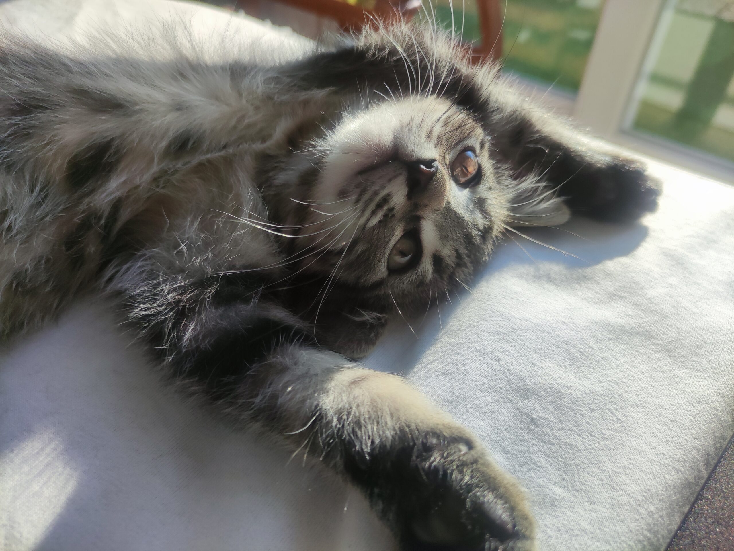 Après une petite semaine « choc » assez stressante pour elle et sa sœur pour s’habituer à la vie en intérieur et au contact répété avec les humains, Nuage a pris confiance en l’homme (et en la vie en appartement !).