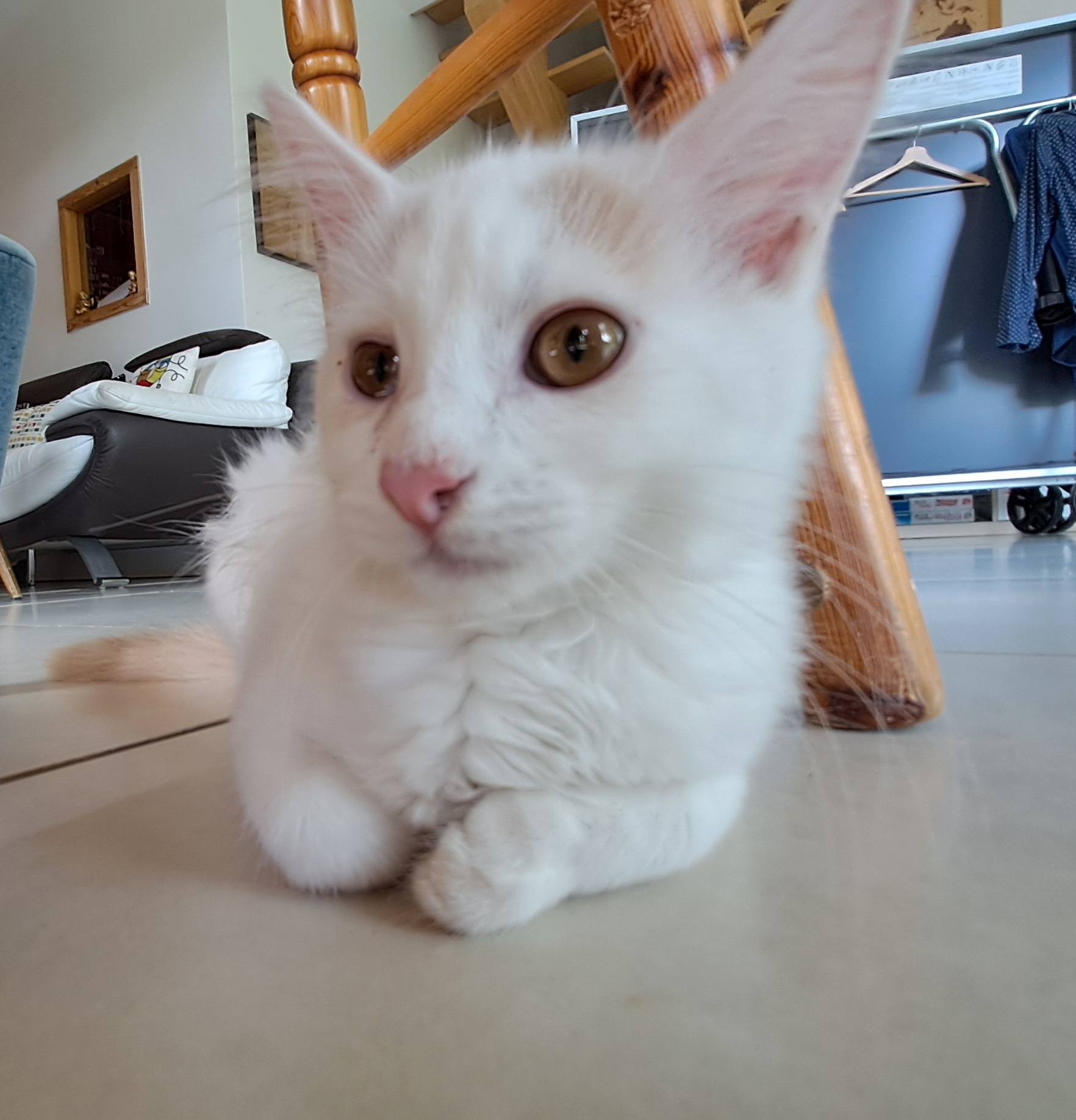 Maintenant qu’elle a confiance, c’est un amour, elle ronronne et vient chercher les câlins.  Par contre  se méfier, quand on lui donne sa pâtée, ayant sûrement endurée la faim, on peut se prendre quelques coup de pâte.  C’est  pour ça  que je conseille d’éviter les enfants en bas âge.