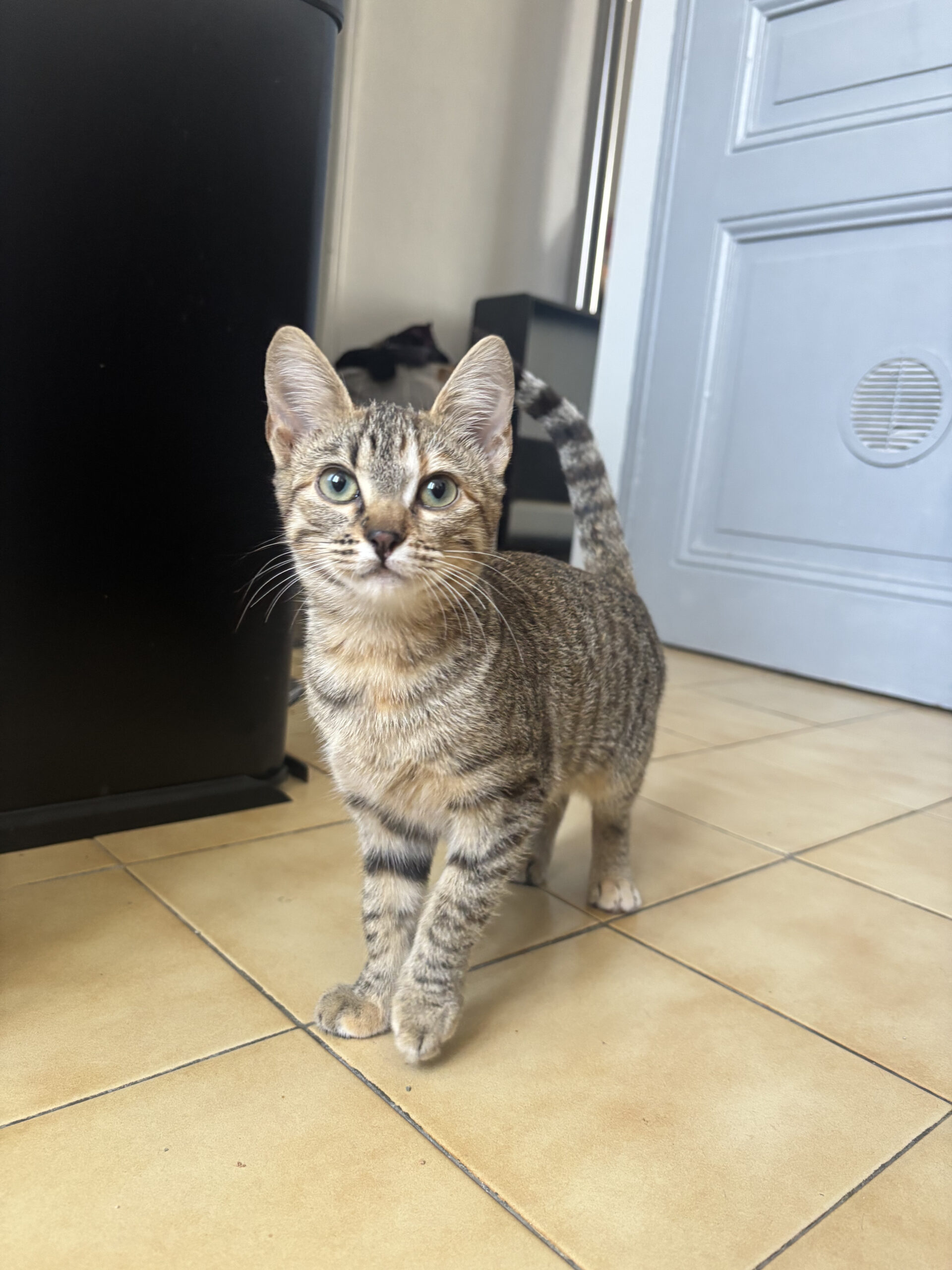Très jolie frimousse, très peureuse (au début), très câline après, Sheba n’aime pas rester dans un coin seule.