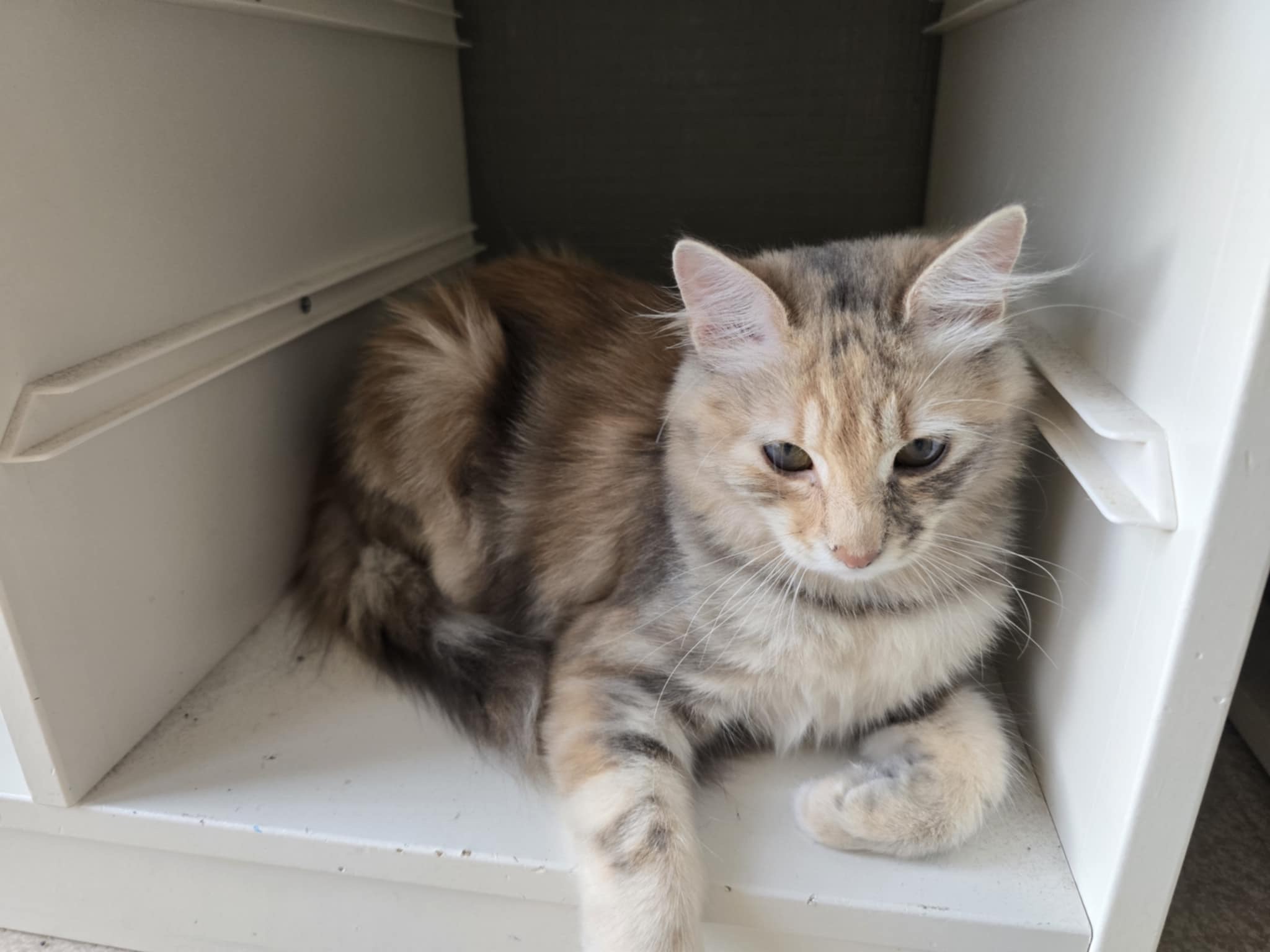 Très jolie frimousse, très peureuse (au début), très câline après, Sheba n’aime pas rester dans un coin seule.