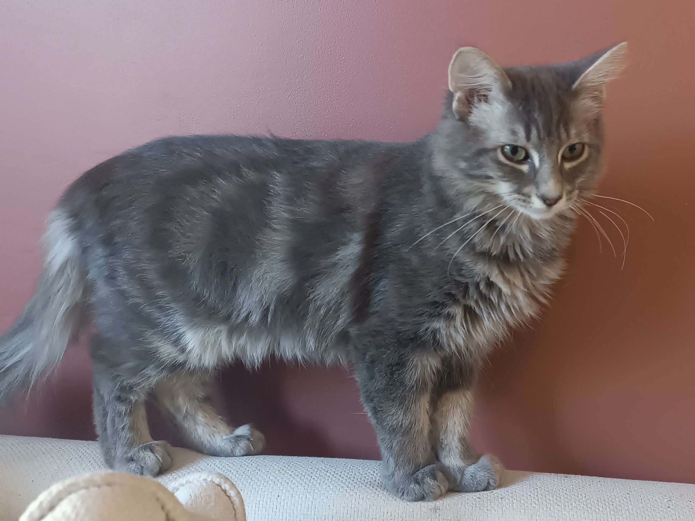 Mise en sécurité rapidement, elle est arrivée toute timide, ne semblant pas connaitre le confort d’une maison. Elle a dormi à même le sol les premiers jours, avant de se rendre compte que le coussin serait plus confortable, et plus longtemps encore avant d’oser monter sur le canapé.