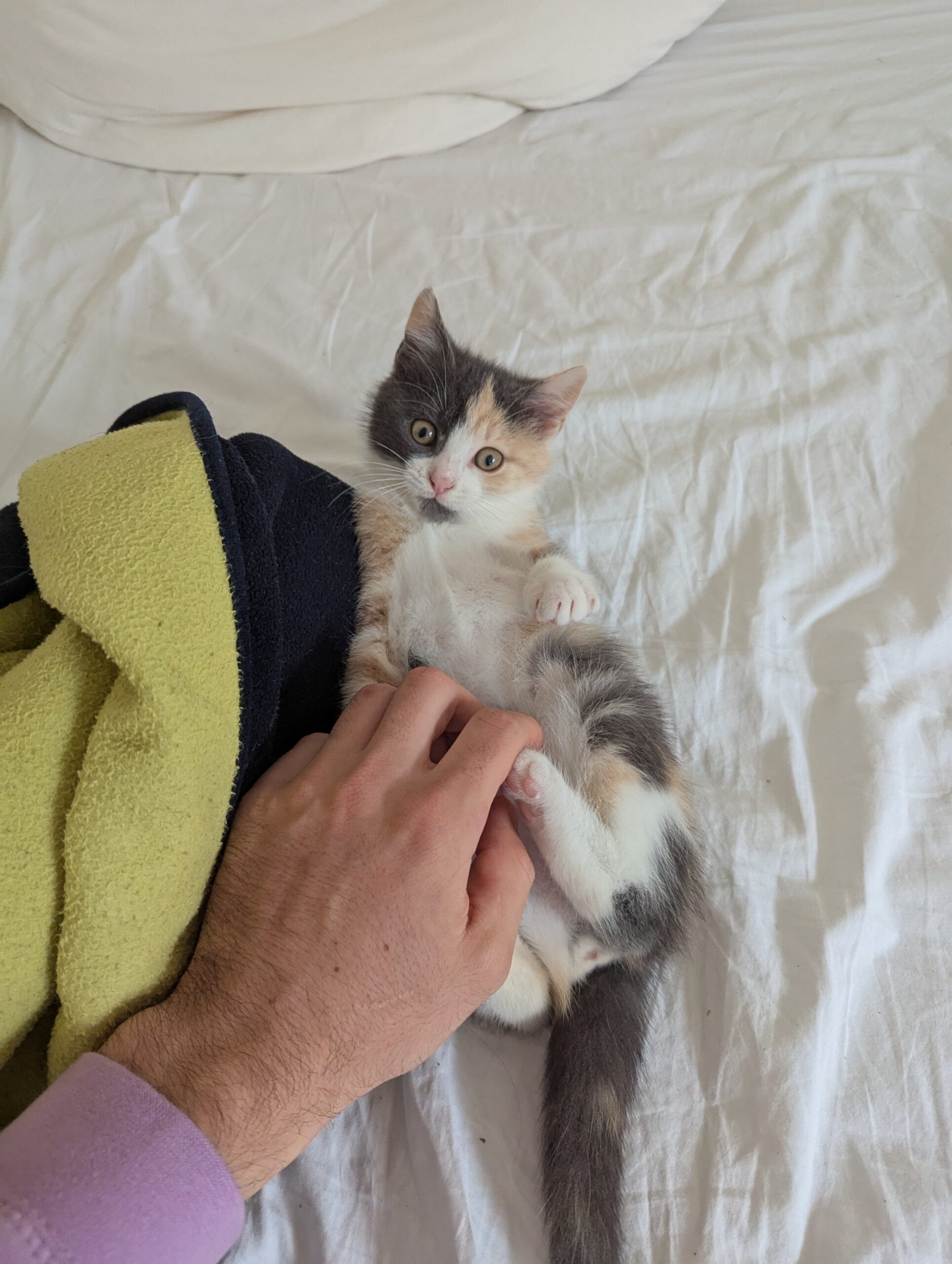 Gipsy est une jeune femelle , écaille de tortue qui est née  approximativement  autour du 1er octobre 2024. Elle a été trappée avec ses 3 chatons .