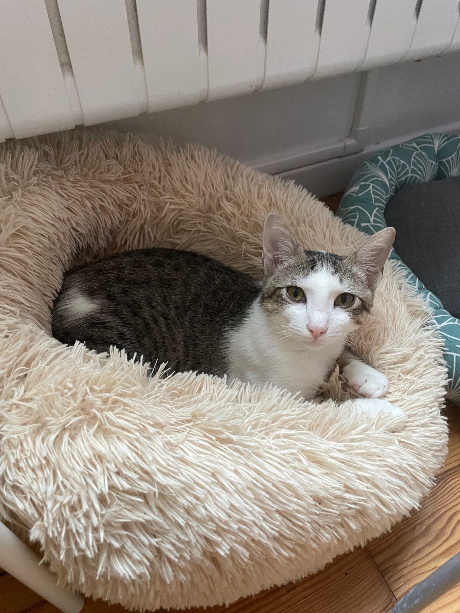 Mise en sécurité rapidement, elle est arrivée toute timide, ne semblant pas connaitre le confort d’une maison. Elle a dormi à même le sol les premiers jours, avant de se rendre compte que le coussin serait plus confortable, et plus longtemps encore avant d’oser monter sur le canapé.