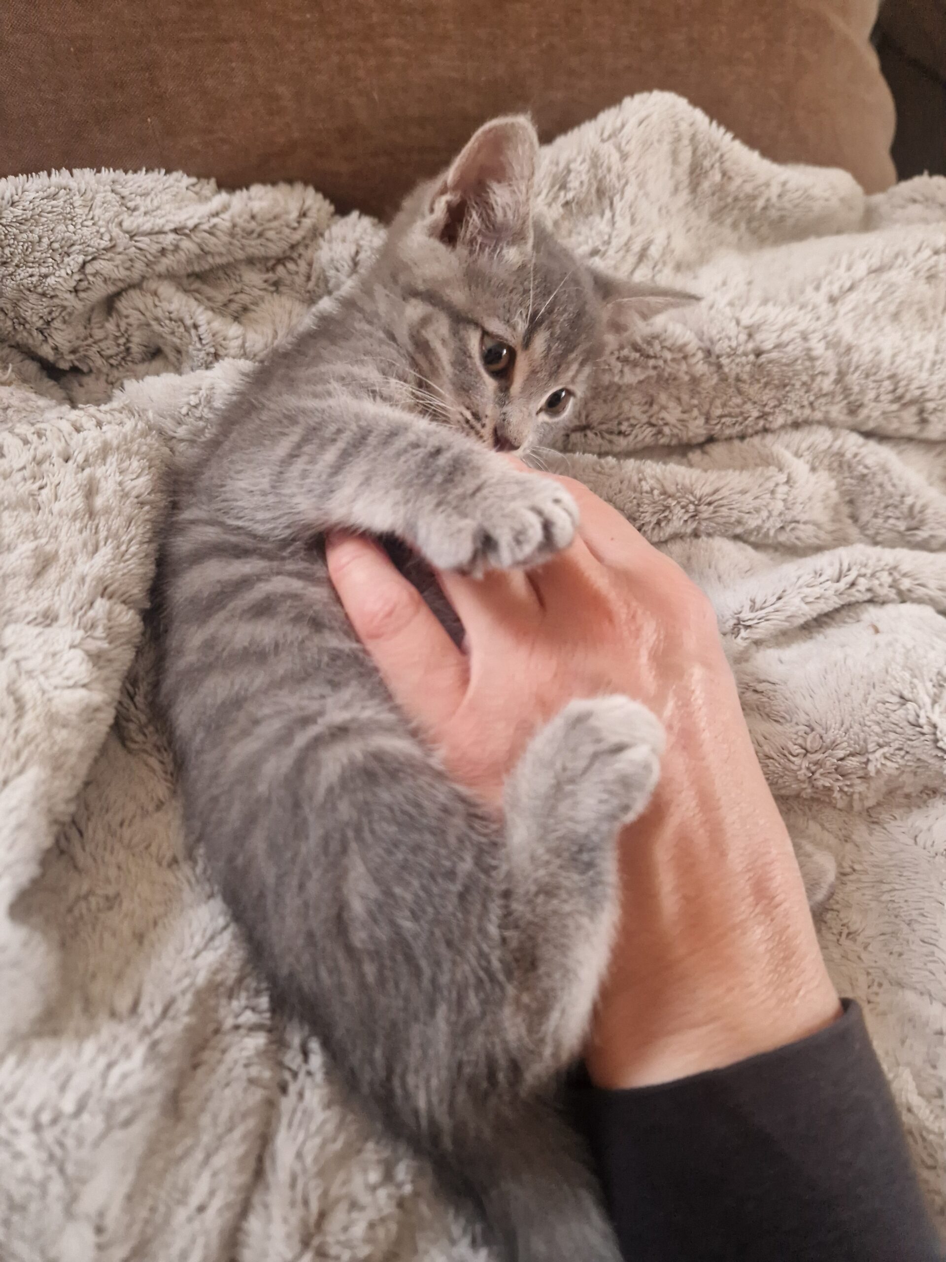 Arrivé craintif, ce petit loulou a fait des progr Arrivé craintif, ce petit loulou a fait des progrès immenses en seulement 48h (cela peut prendre beaucoup plus de temps 😅). Il apprend doucement que la main de l'humain est faite pour les câlins, pas pour faire mal.