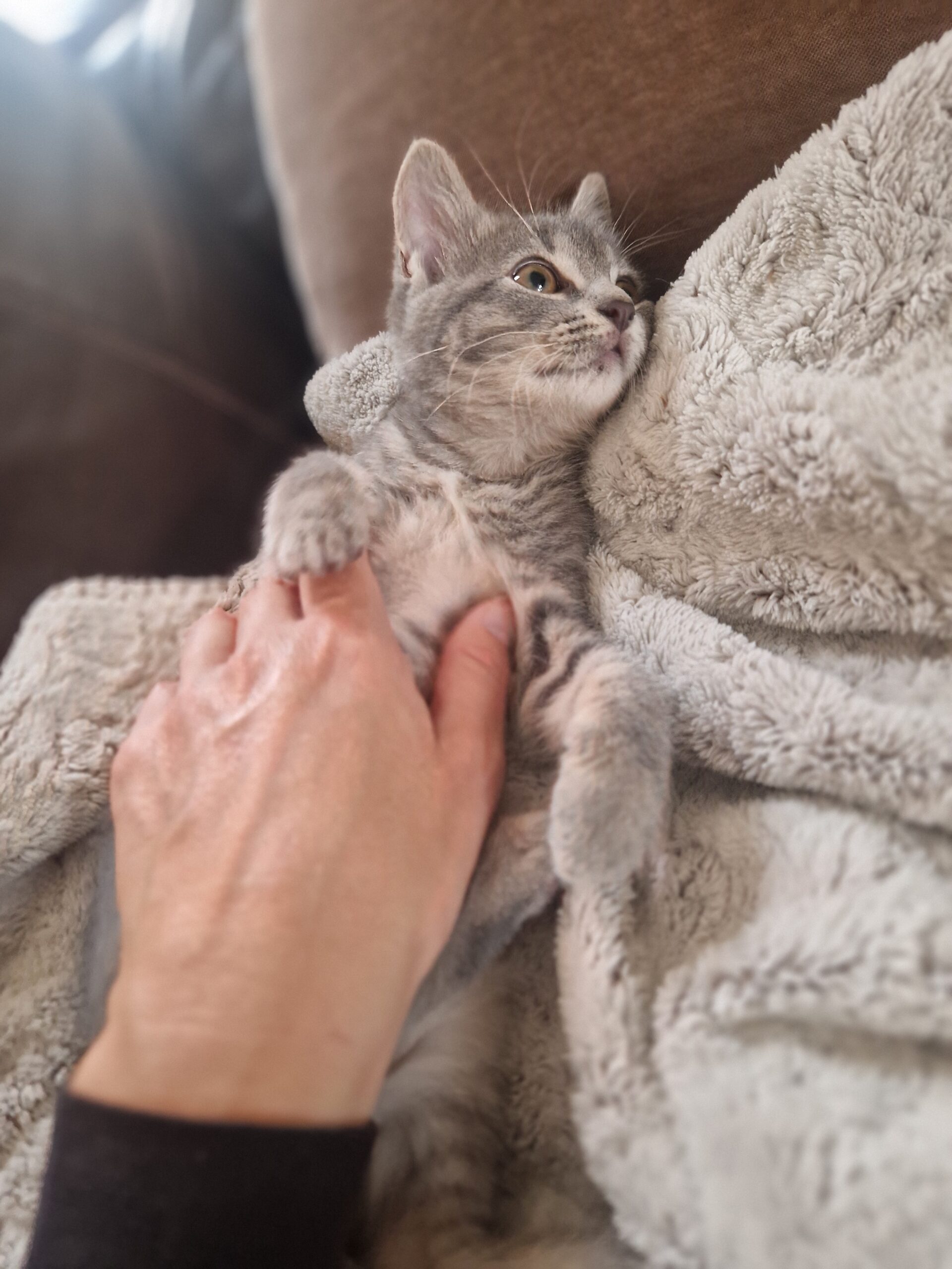 Après une petite semaine « choc » assez stressante pour elle et sa sœur pour s’habituer à la vie en intérieur et au contact répété avec les humains, Nuage a pris confiance en l’homme (et en la vie en appartement !).