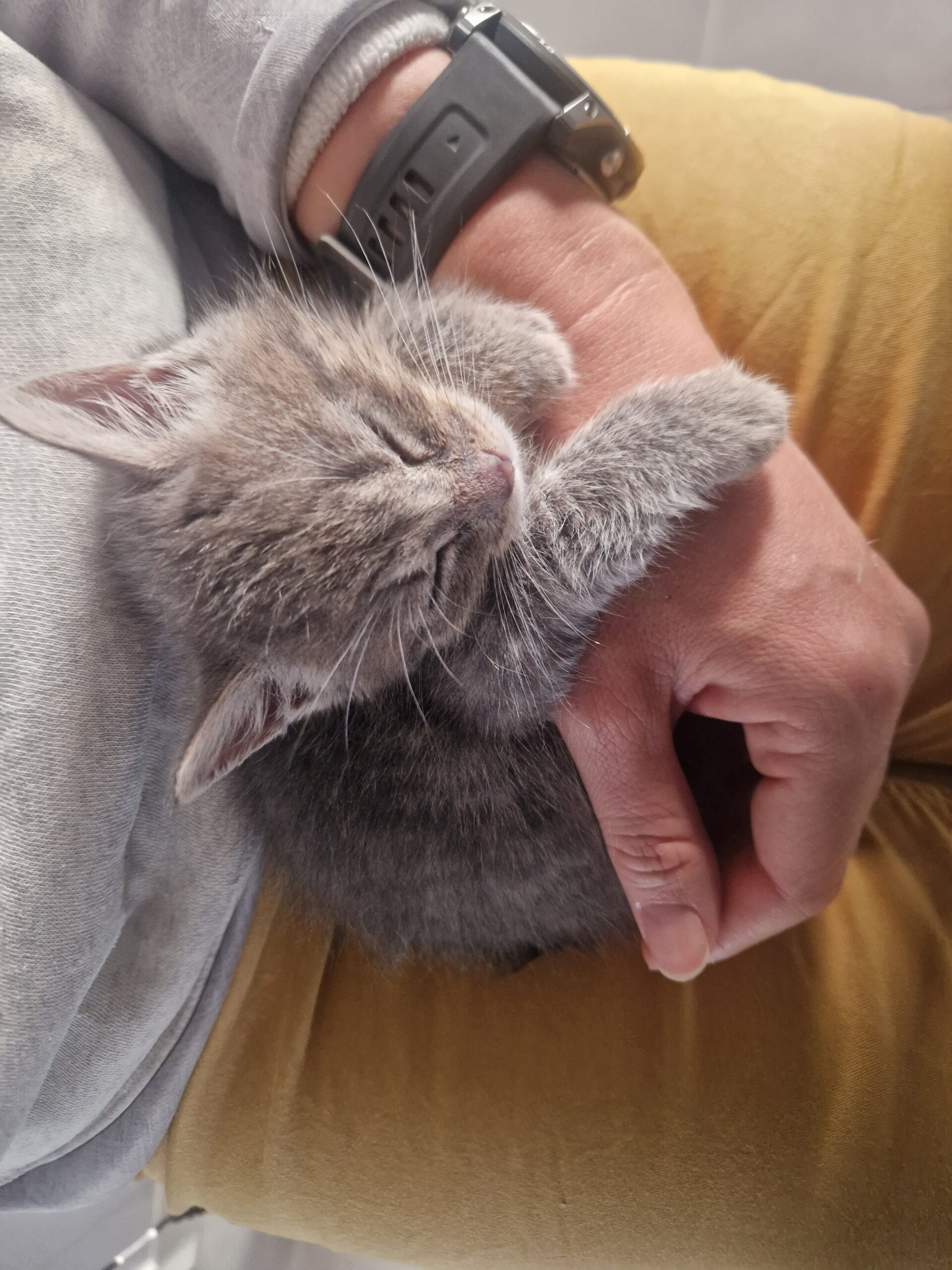 Après une petite semaine « choc » assez stressante pour elle et sa sœur pour s’habituer à la vie en intérieur et au contact répété avec les humains, Nuage a pris confiance en l’homme (et en la vie en appartement !).
