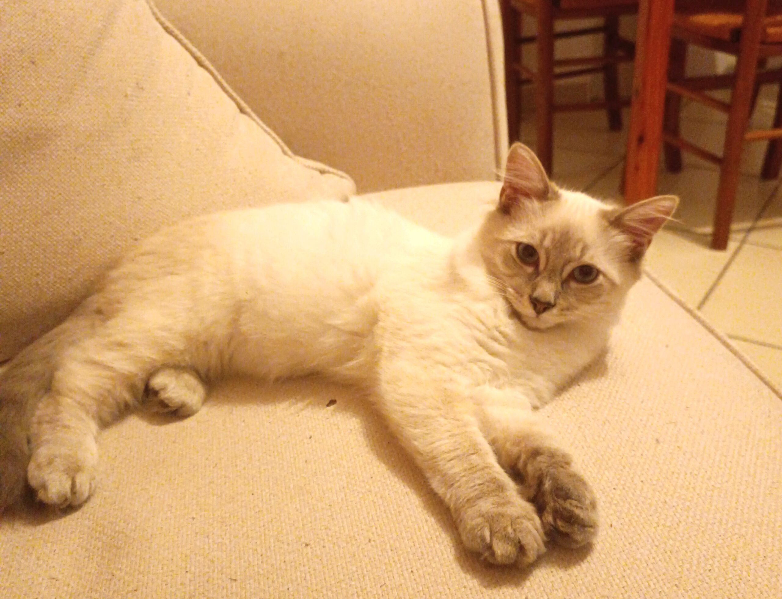 Mise en sécurité rapidement, elle est arrivée toute timide, ne semblant pas connaitre le confort d’une maison. Elle a dormi à même le sol les premiers jours, avant de se rendre compte que le coussin serait plus confortable, et plus longtemps encore avant d’oser monter sur le canapé.