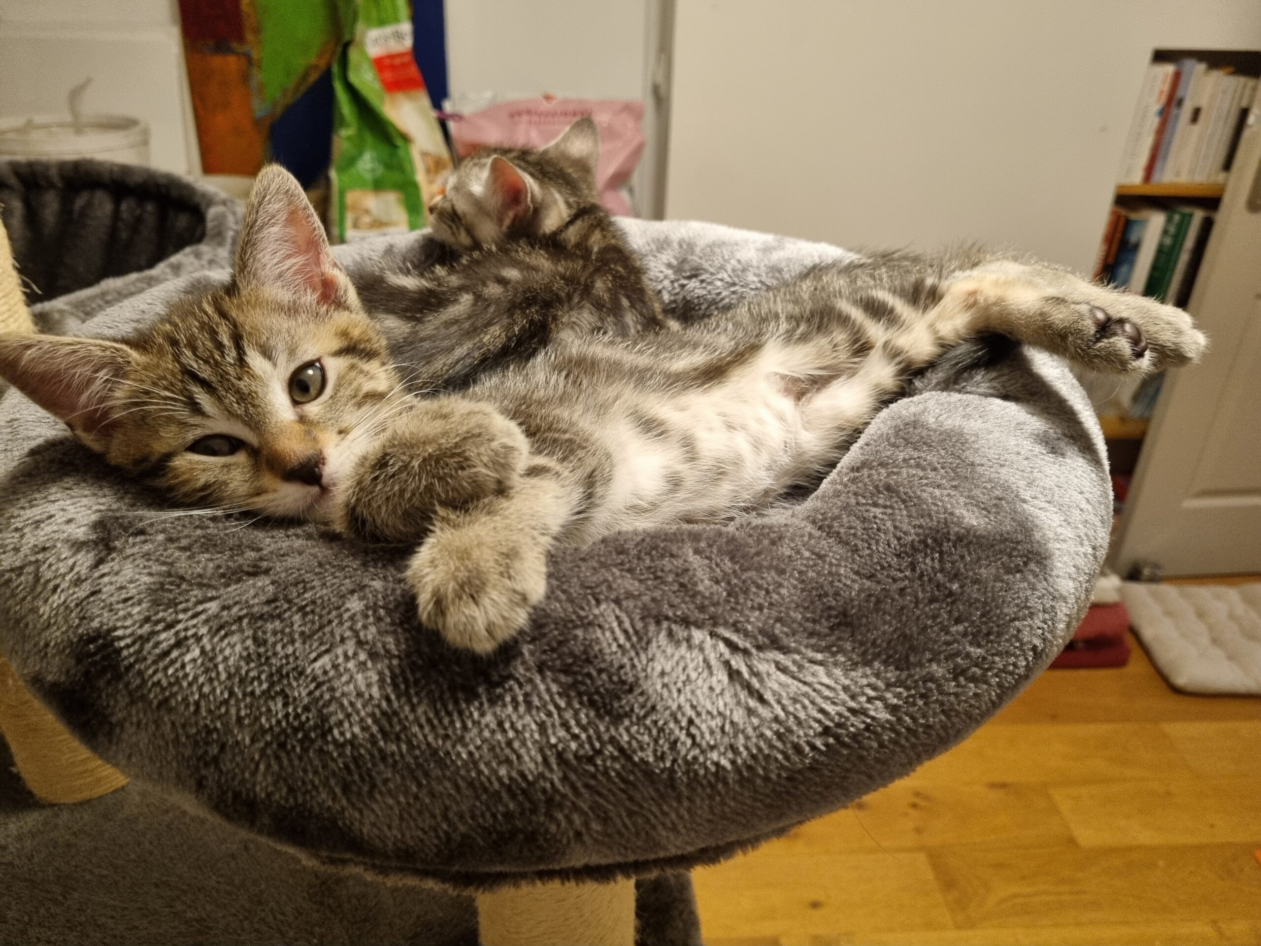 Mise en sécurité rapidement, elle est arrivée toute timide, ne semblant pas connaitre le confort d’une maison. Elle a dormi à même le sol les premiers jours, avant de se rendre compte que le coussin serait plus confortable, et plus longtemps encore avant d’oser monter sur le canapé.