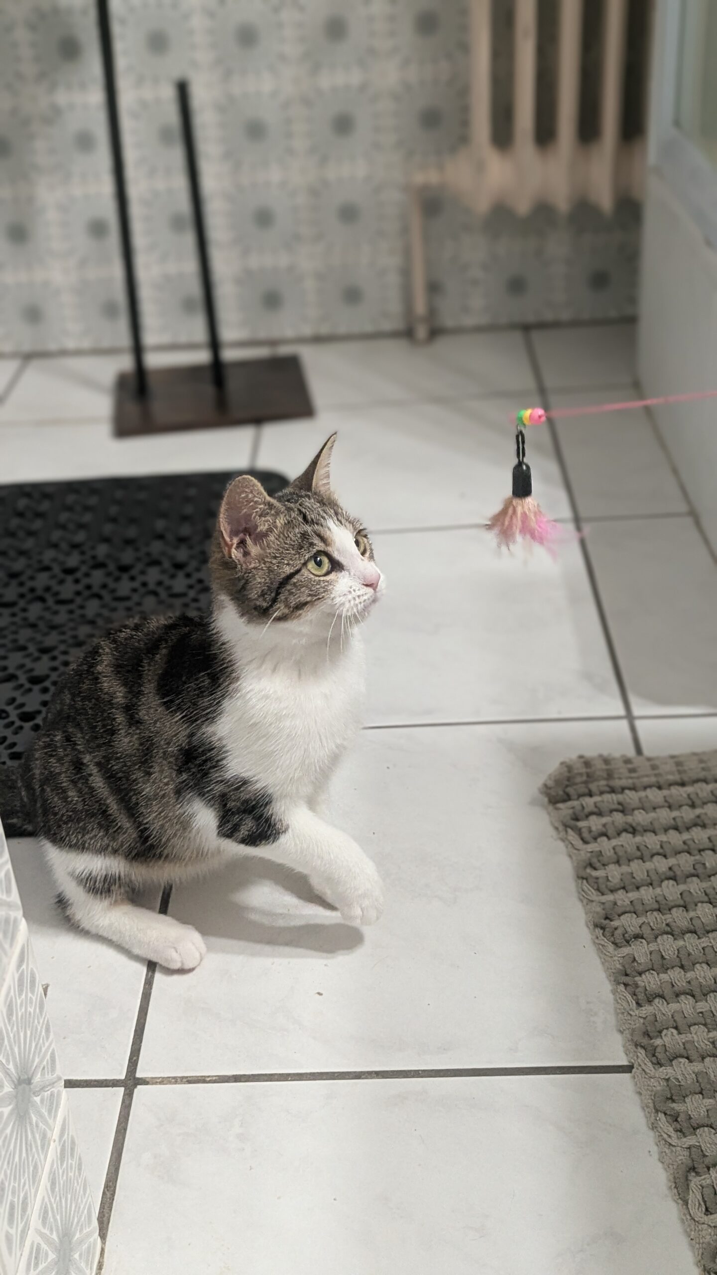 Elle aime énormément tremper ses jouets dans la gamelle d’eau et les balader un peu partout.