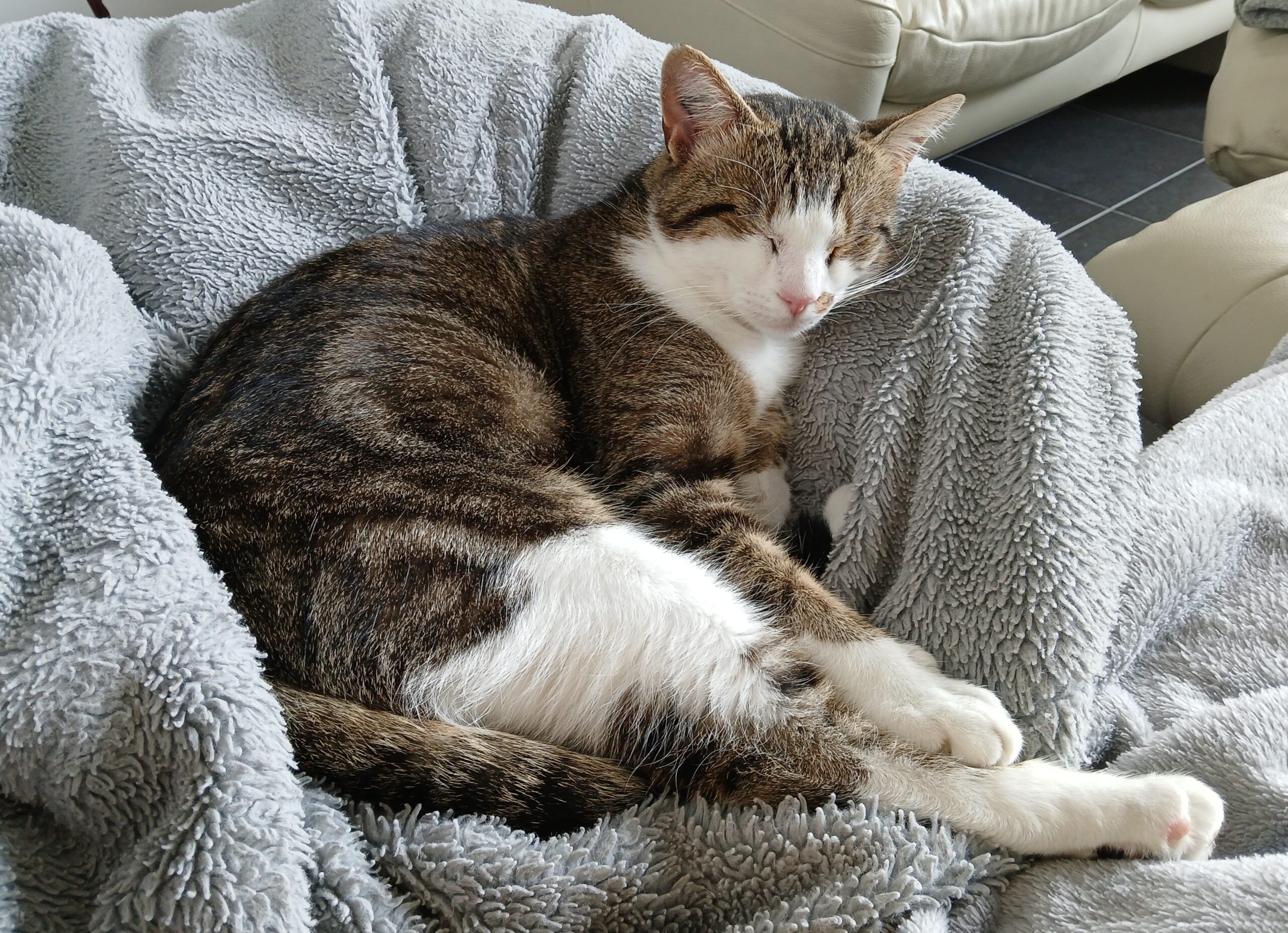 Je suis noire et blanc, j’aime bien feuler un petit peu vis-à-vis des autres chats mâles mais finalement, au bout d’un moment je m’en accommode. Et après je peux me coucher en tout sécurité près d’eux.