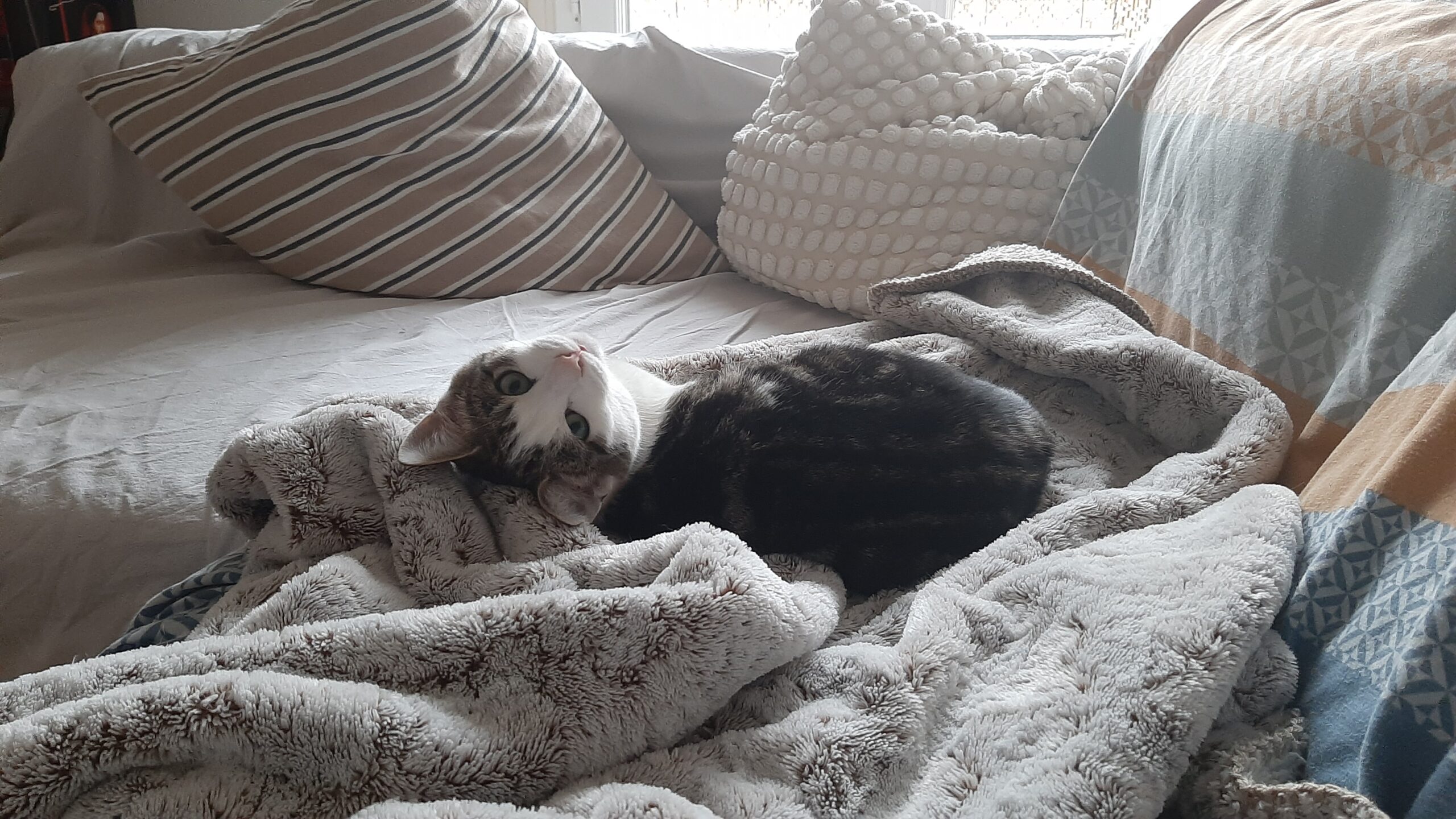 Après une petite semaine « choc » assez stressante pour elle et sa sœur pour s’habituer à la vie en intérieur et au contact répété avec les humains, Nuage a pris confiance en l’homme (et en la vie en appartement !).