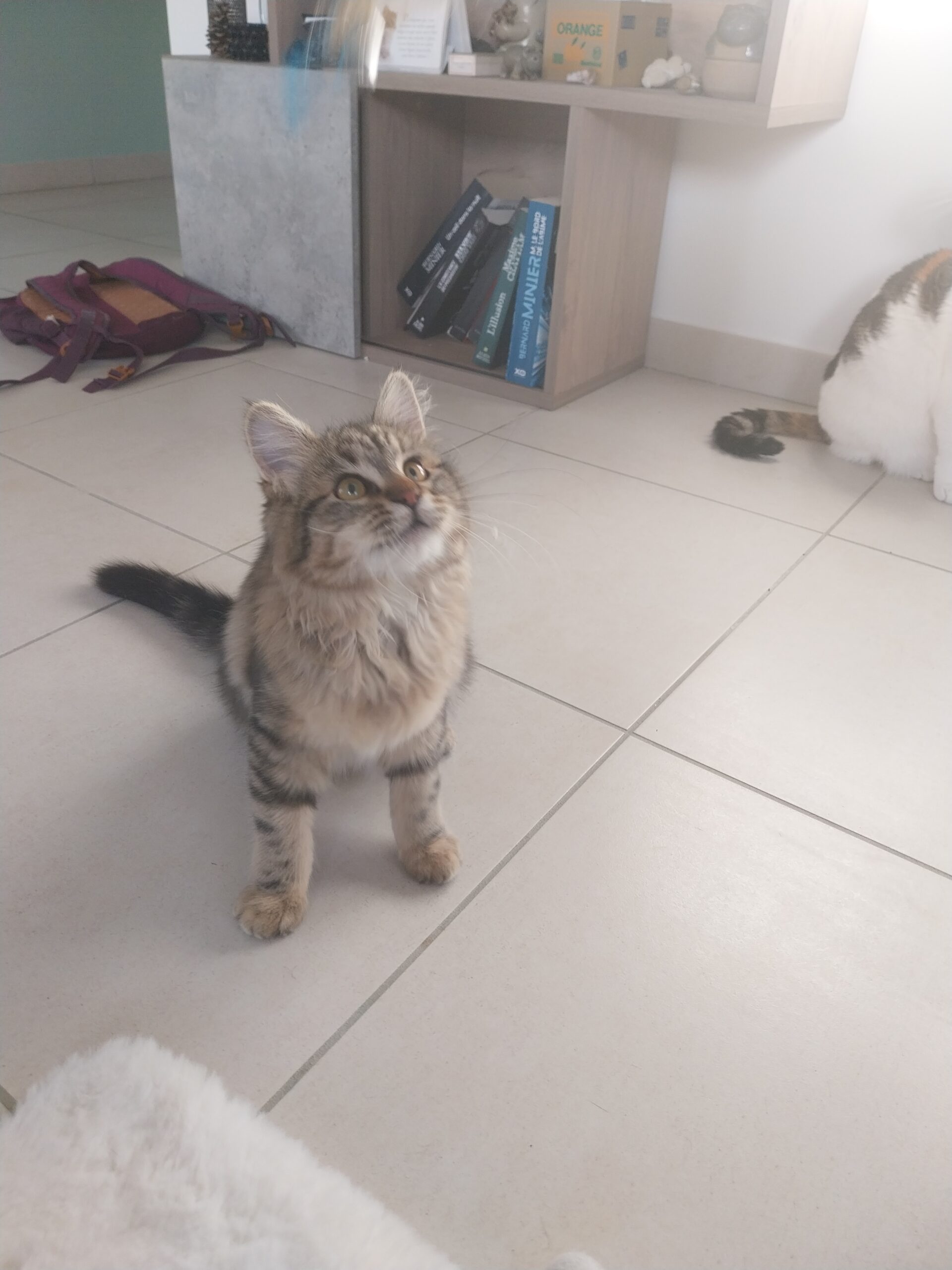 J’ai été trouvé et heureusement mis à l’abri du froid car j’étais tout petit et craintif. Maintenant Je suis un petit chaton qui découvre tout, aime tout voir, joue énormément et avec tous. Du jouet chat à un bouchon, au chouchou cheveux. Tous et un jouer pour moi et j’adore jouer.