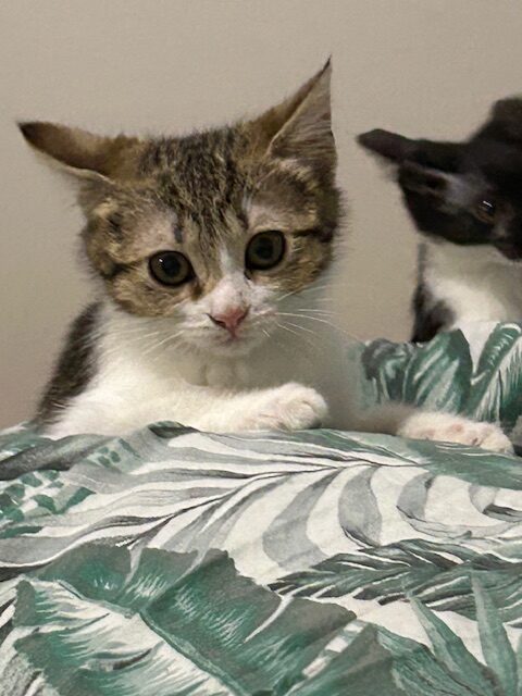 Canaille est un beau mâle blanc et tigré d’environ 6 mois.