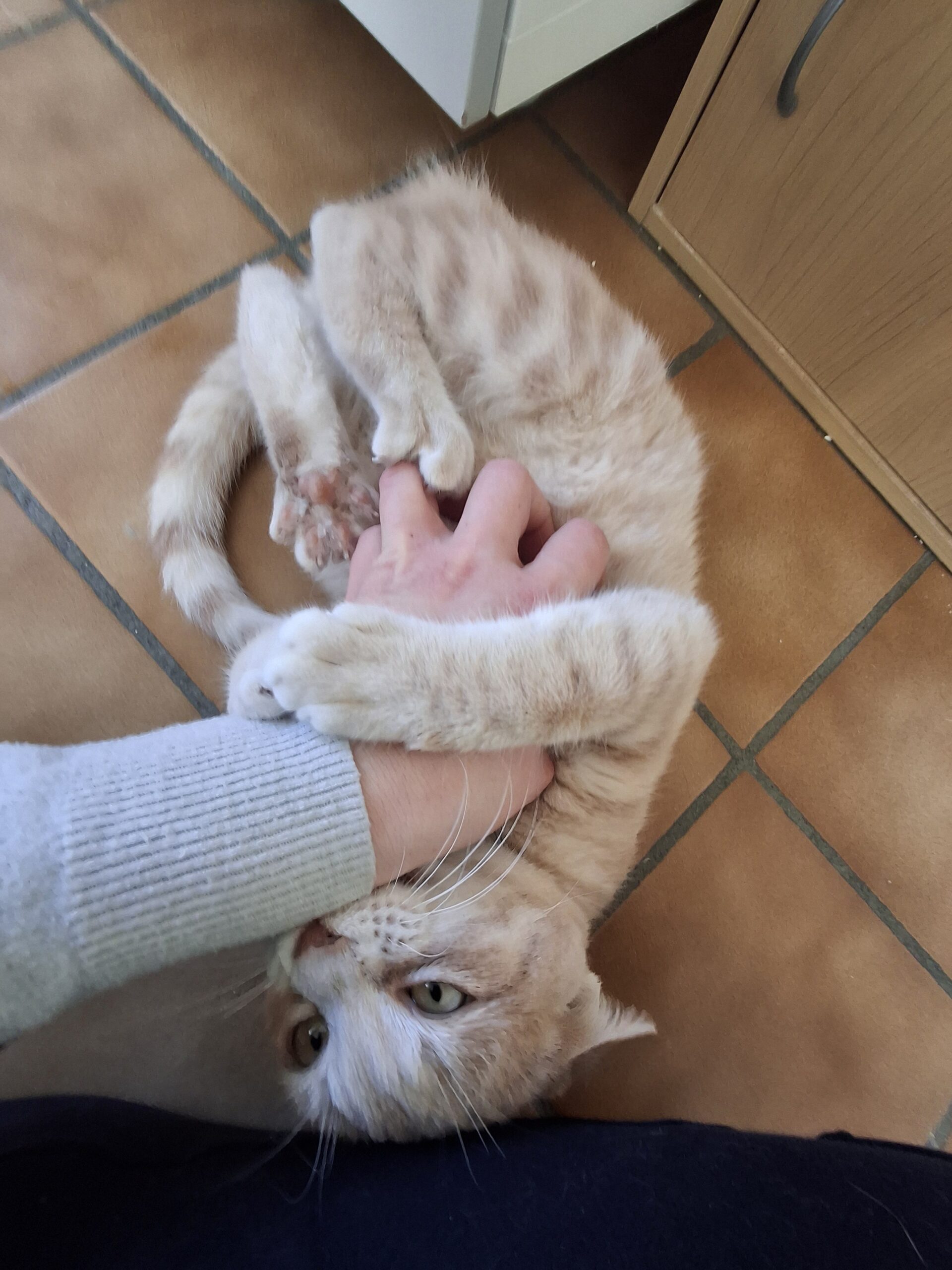 Apres ritualisation et mise en confiance, Moka attend les calins qu’elle affectionne beaucoup.