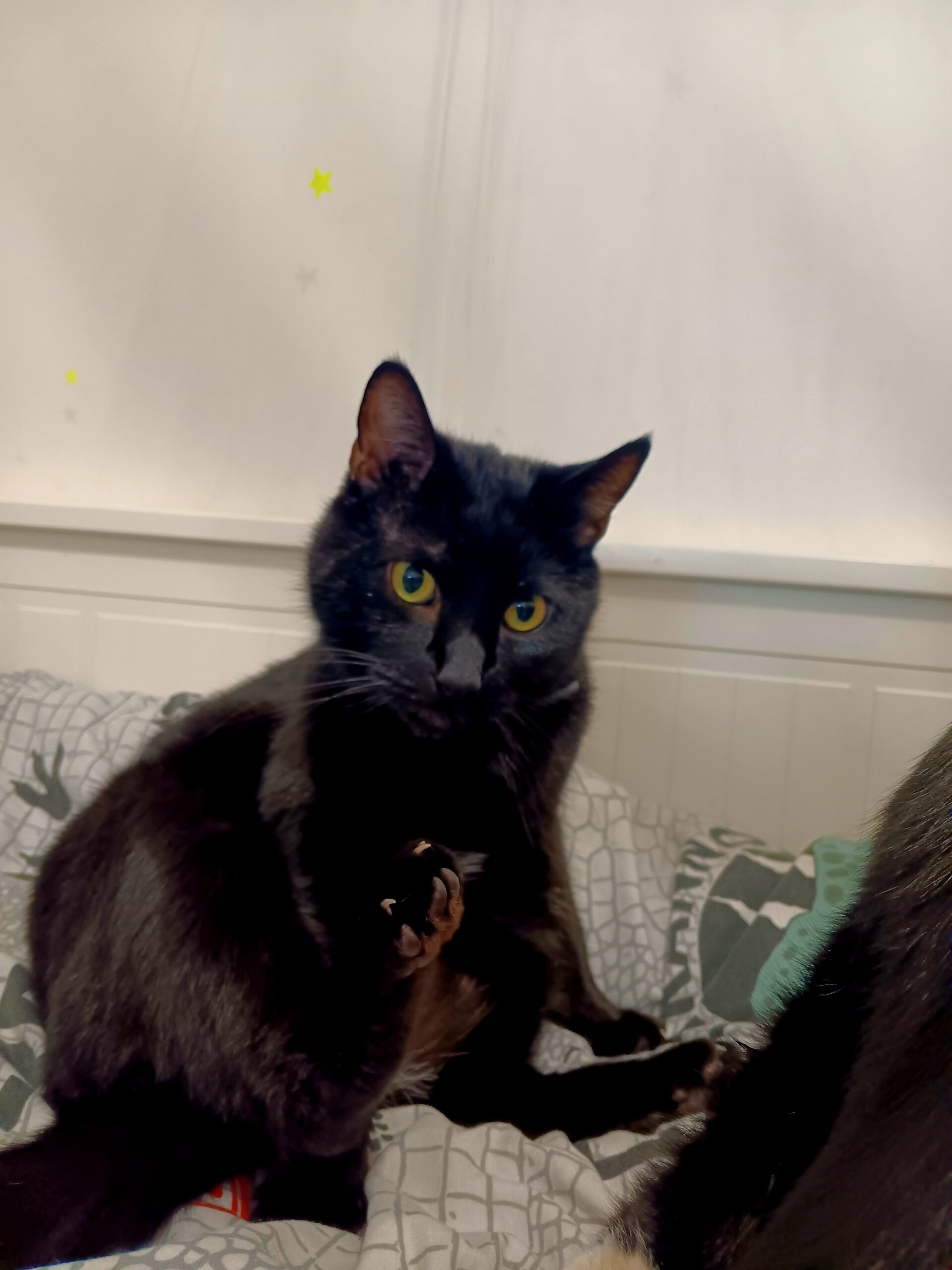 Bali est un magnifique chat noir au regard profond, né en 2024. Élégant et apaisant, il apporte immédiatement une présence douce et rassurante dans la maison.