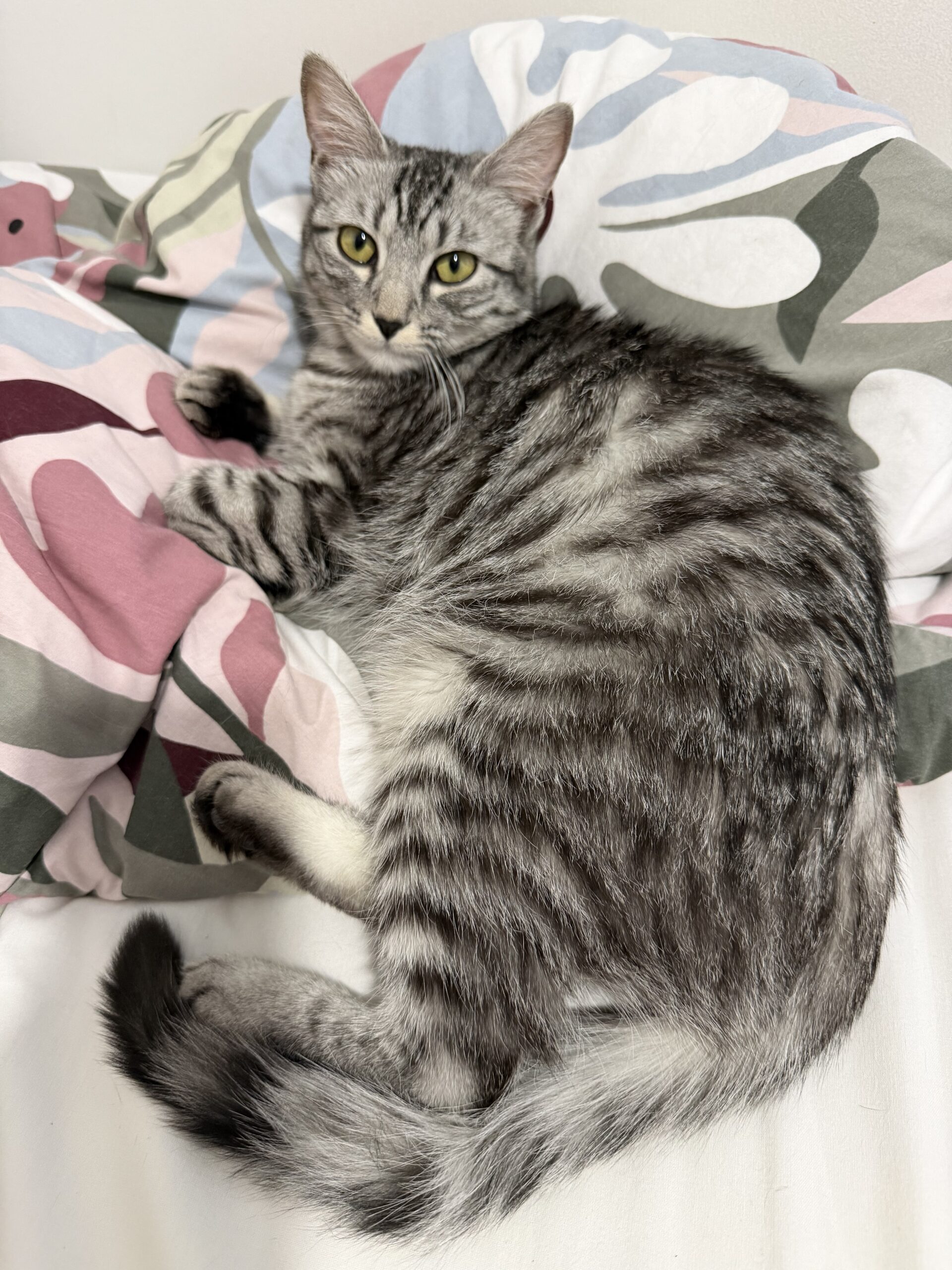 Une fois que vous l’avez ? Vous découvrirez un chat joueur et curieux, pro de la chasse aux boulettes de papier et de l’attaque acrobatique de fil, qui vous émerveillera de moult mouvements d’art martiaux de sa création. Une fois fatigué de ses prouesses, il aime dormir contre les jambes bien au chaud sur le lit. Il vient de découvrir le bonheur des caresses et s’y habitue encore (il faut y aller doucement et lui laisser le temps) mais en demande de plus en plus!