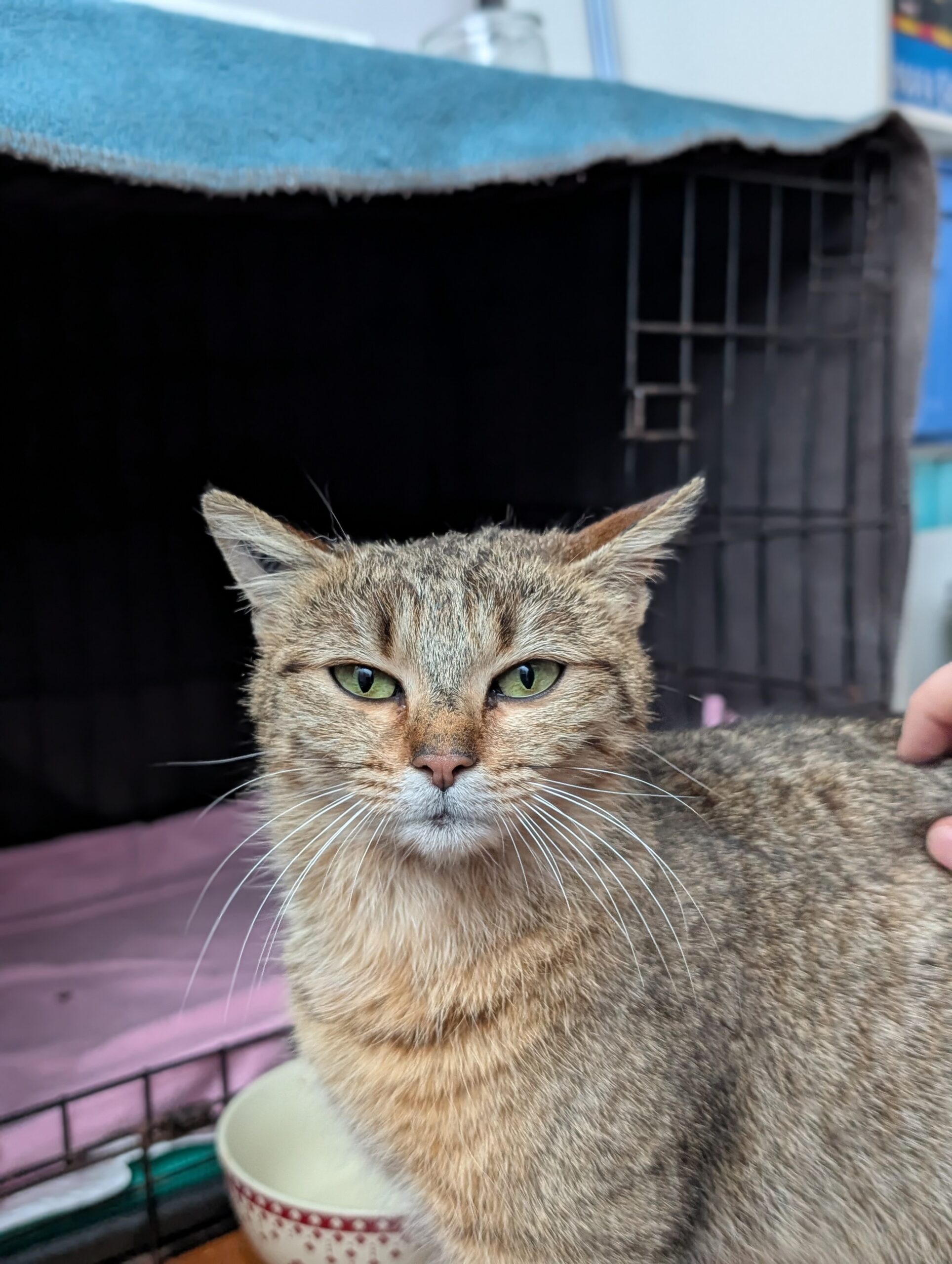 Grand chaton qui apprend encore à faire confiance aux humains, il faudra de la patience pour le faire sortir de sa cachette et gagner sa confiance.