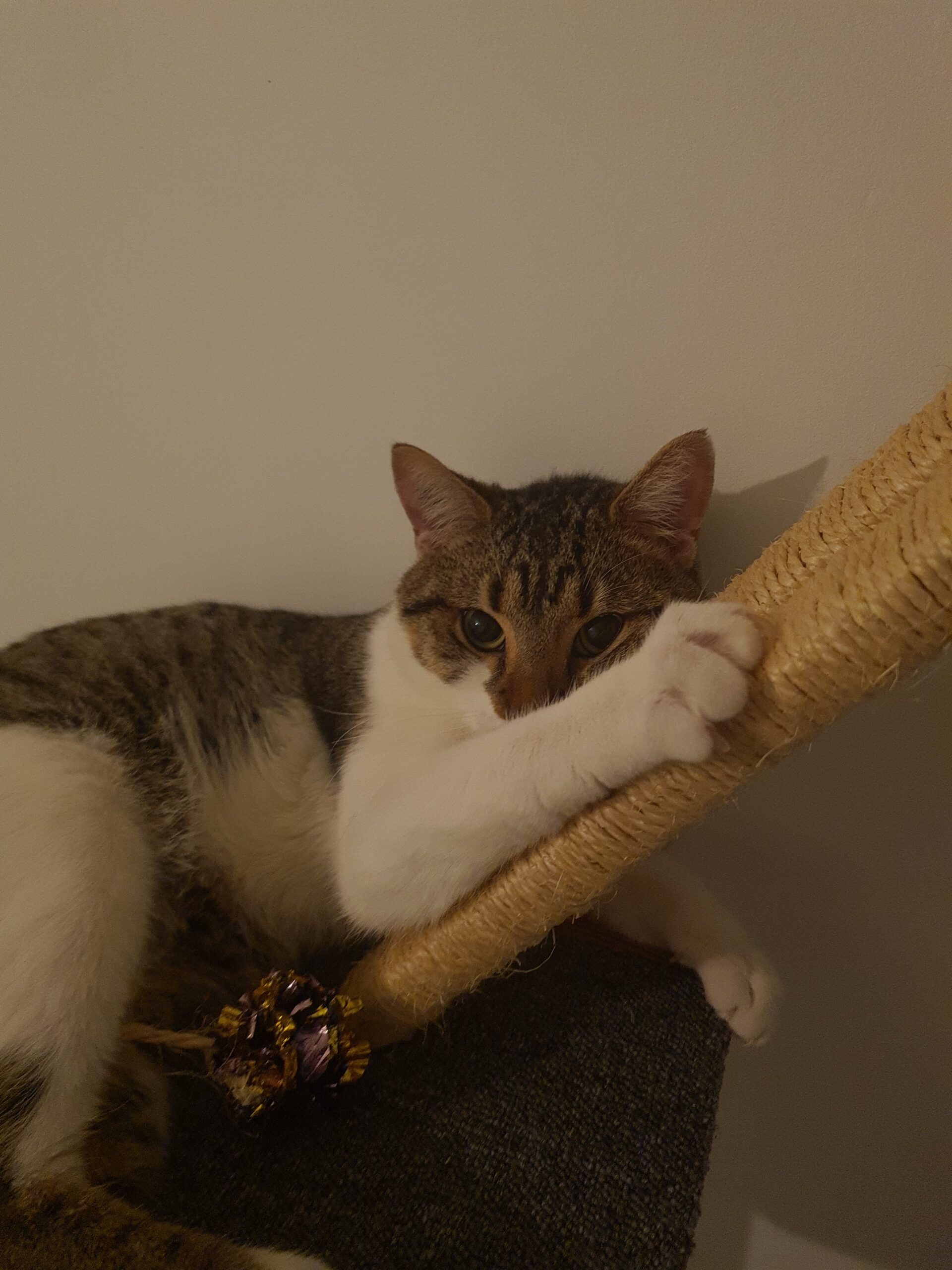 Une fois que vous l’avez ? Vous découvrirez un chat joueur et curieux, pro de la chasse aux boulettes de papier et de l’attaque acrobatique de fil, qui vous émerveillera de moult mouvements d’art martiaux de sa création. Une fois fatigué de ses prouesses, il aime dormir contre les jambes bien au chaud sur le lit. Il vient de découvrir le bonheur des caresses et s’y habitue encore (il faut y aller doucement et lui laisser le temps) mais en demande de plus en plus!