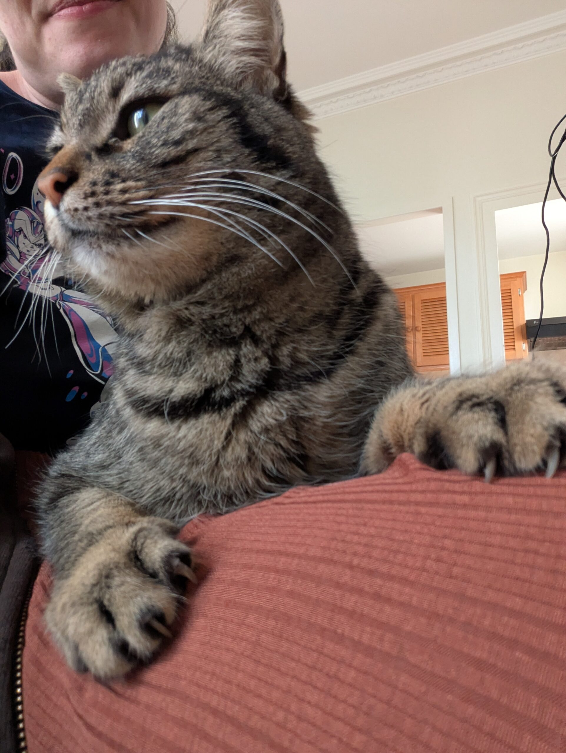 Aujourd’hui, Médusa est devenue une vraie accro aux câlins. Elle tient absolument à avoir ses caresses dès que moi, son humaine, je passe la porte, toujours au même endroit, sur “son fauteuil”. Elle reste très ritualisée sur les lieux et les moments, mais ensemble nous avons construit une relation forte et rassurante pour nous deux !