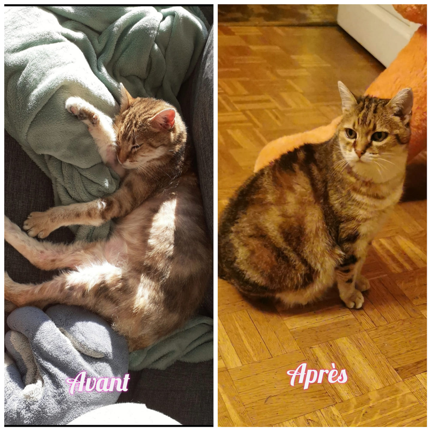 Elle garde malgré tout certaines peurs : elle reste inquiète face à des bruits comme l’aspirateur ou le balai, et se tend quand plusieurs humains arrivent en même temps. Mais une fois la pièce redevenue calme, elle vient volontiers réclamer des câlins, même aux personnes qu’elle ne connaissait pas au départ. »