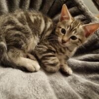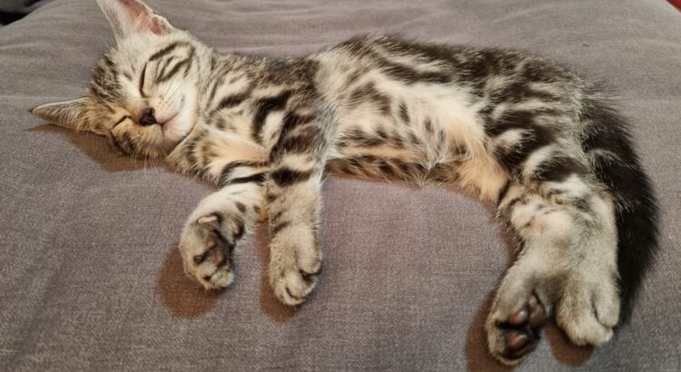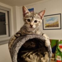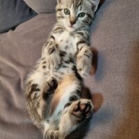 Par ailleurs il a grandi dans un foyer humain avec des enfants. Il est donc très sociable. Comme tout chaton il est joueur mais apprécie aussi les caresses, il ronronne déjà.