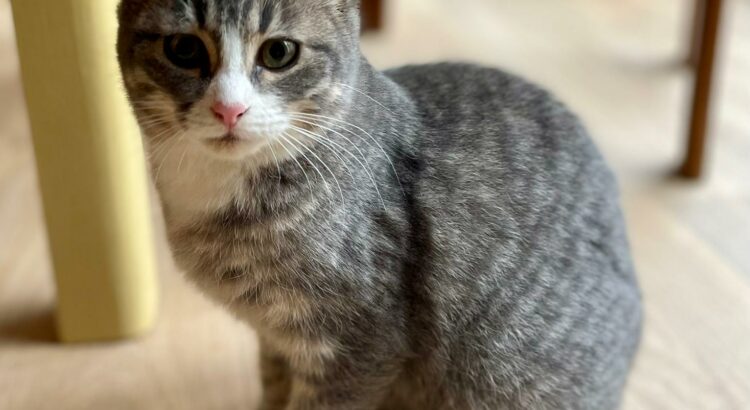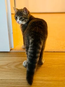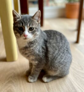 Elle est pour l’instant encore craintive, mais je pense qu’elle est encore au début de sa socialisation, qu’elle a beaucoup a offrir en tant que chatte de compagnie, avec un peu de temps et de patience pour prendre confiance en ses humains.