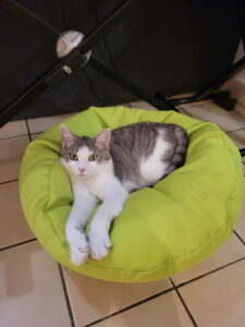Mimousse est la plus à l’aise des deux : joueuse, gourmande et bavarde, elle commence à accepter les caresses et le jeu avec l’humain, même si elle n’aime pas encore être portée.