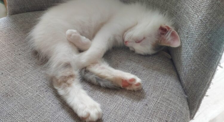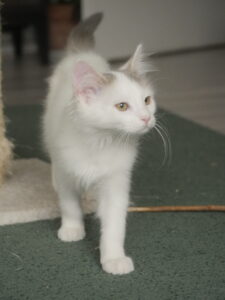 Filou est un chaton blanc et gris né vers le 15 juillet 2025. Il est arrivé dans notre famille d’accueil avec sa sœur Féline également à l’adoption.