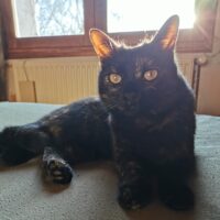 Gigi est une magnifique minette noire née en mai 2025, sauvée à Saint-Andéol avec sa sœur. Son histoire est celle d’une grande timide qui a appris à se battre pour survivre, mais qui commence doucement à baisser la garde.