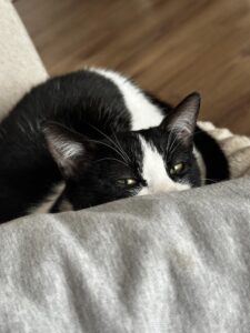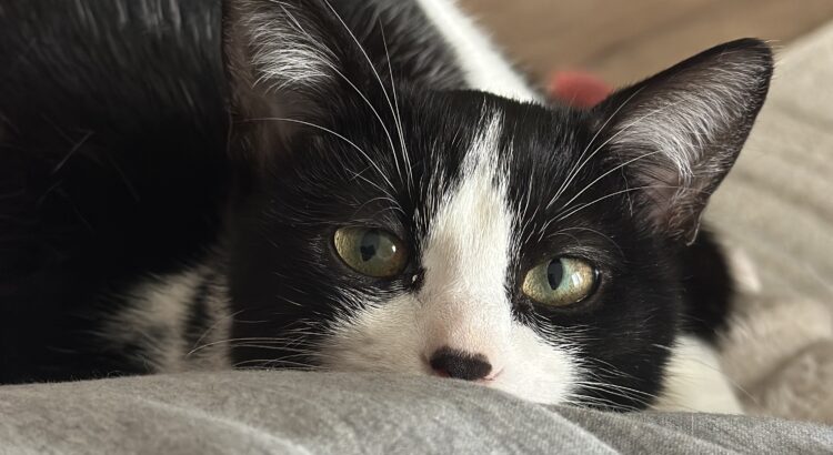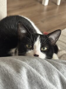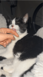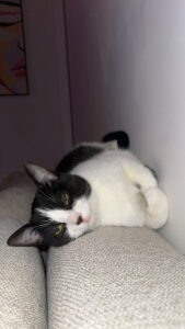 Bonjour! Moi c’est Maou, Je suis une petite minette noir et blanche né en mai 2025, très dynamique, propre et affectueuse.