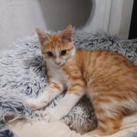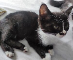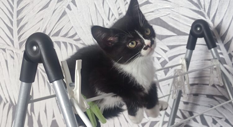 Chaton noir et blanc de 3 mois et demi. C’est un mini-chaton craintif au 1er abord qui une fois en confiance se révèle joueur et câlin. C’est également, malgré son petit gabarit et sa petite queue tordue, un chaton acrobate et très agile. Il a eu des débuts difficiles pour s’alimenter d’où sa petite taille. Aujourd’hui il mange bien ses croquettes mais la pâté reste son péché mignon.