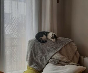 Il est encore un peu craintif, dès qu’un bruit est trop fort ou qu’il y a un geste brusque, il se fige et peut partir se réfugier. Mais il fait des progrès de jour en jour, et il accepte parfois les caresses lorsqu’il se repose. Sa sociabilisation reste donc à parfaire, il faudra un peu de patience pour que Mousse soit en confiance avec l’humain et  accepte pleinement les câlins.