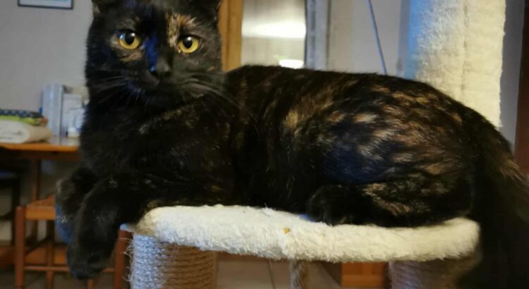 Noumy est une chatte d’un an au pelage écaille de tortue.