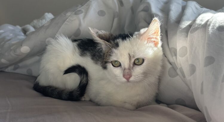 Suki est une petite chatte d’environ deux mois et demi, très craintive, elle a besoin de patience et de bienveillance. Elle recherche un foyer calme, sans enfants, avec une personne présente et attentive, prête à prendre le temps de créer un vrai lien avec elle.