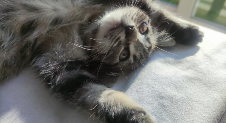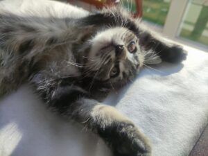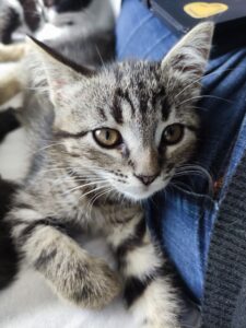 Chaton tigré de 3 mois et demi. Toujours le 1er pour les câlins, les jeux et la pâté. Il s’exprime beaucoup et vient facilement vers les personnes. Une fois apprivoisé il se révèle un vrai pot de colle . Il lui faudra une famille présente pour lui apporter sa dose de câlins quotidienne.