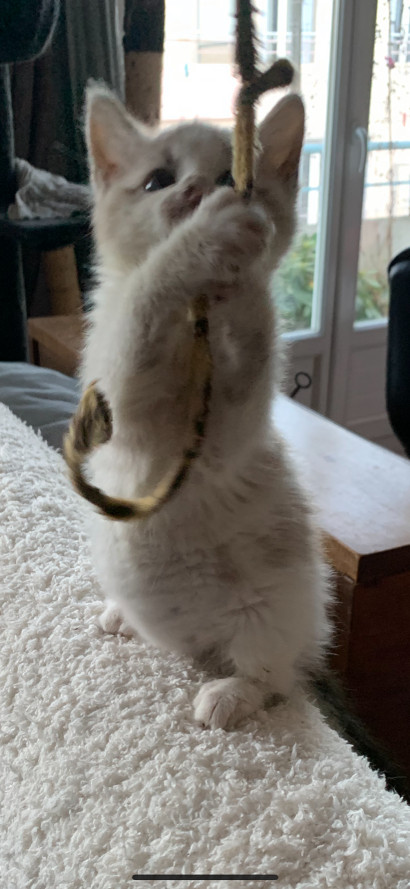 Une fois que vous l’avez ? Vous découvrirez un chat joueur et curieux, pro de la chasse aux boulettes de papier et de l’attaque acrobatique de fil, qui vous émerveillera de moult mouvements d’art martiaux de sa création. Une fois fatigué de ses prouesses, il aime dormir contre les jambes bien au chaud sur le lit. Il vient de découvrir le bonheur des caresses et s’y habitue encore (il faut y aller doucement et lui laisser le temps) mais en demande de plus en plus!