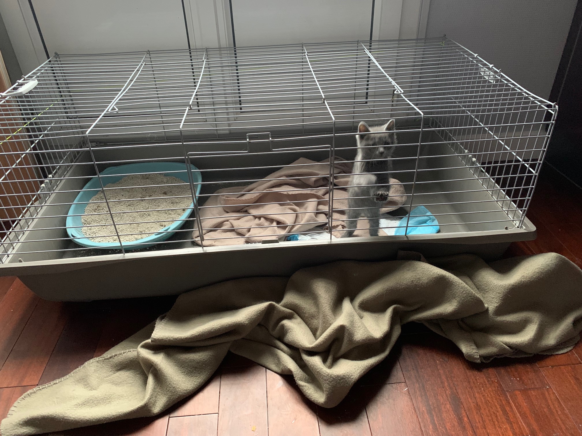 Attention, il peut vite passer des câlins au jeu sans prévenir et attaquer les mains mais il comprend très bien le « non » et s’arrêtera rapidement. Il peut être actif la nuit (il joue et court dans la chambre) et se cacher un peu plus la journée s’il est seul, et il craint les mouvements brusques ou les bruits soudains qui le renvoient immédiatement dans sa cachette. S’il ne sort pas, pas de panique ! Il montrera toujours le bout de ses moustaches pour une petite friandise.
