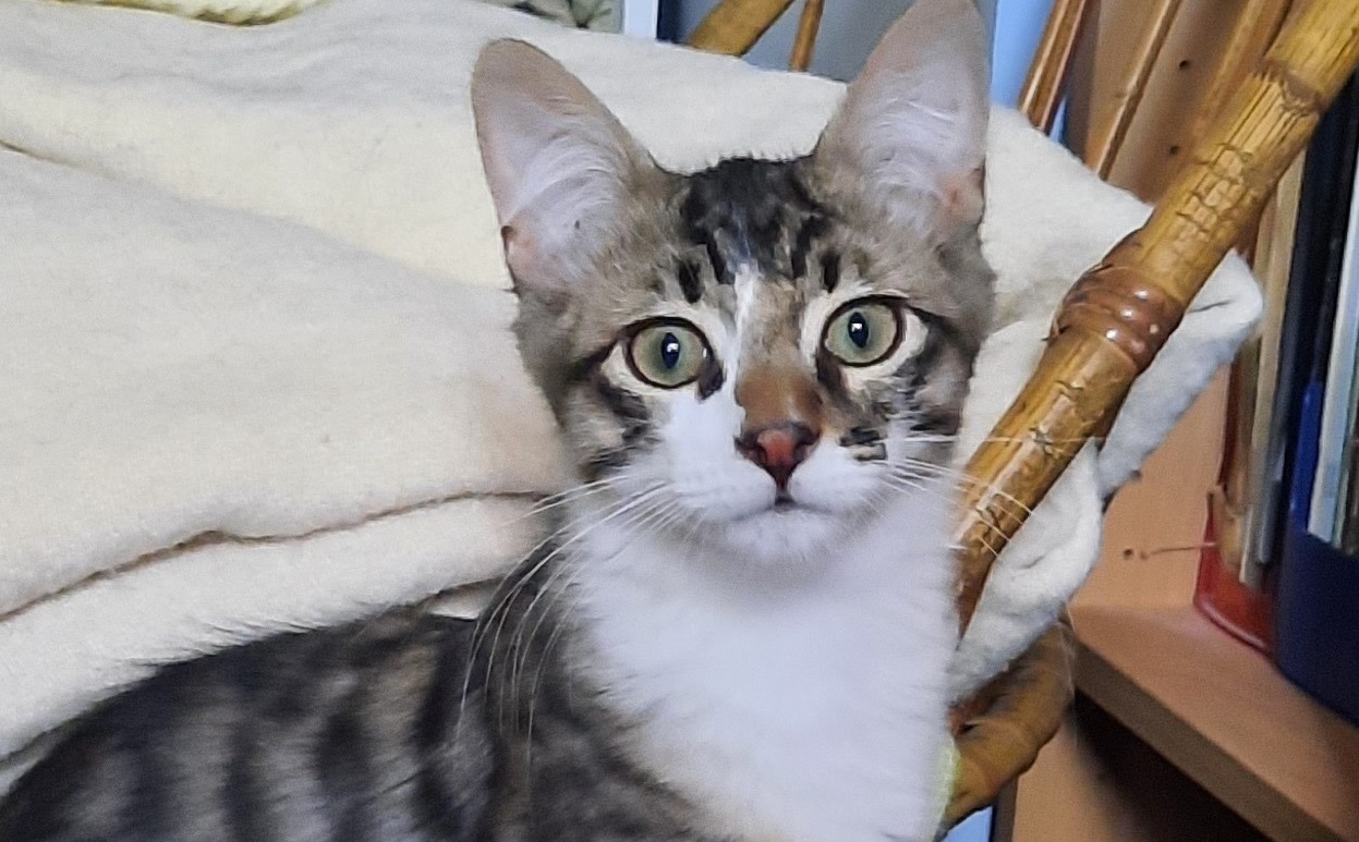 Ninja est une petite chatte tigrée et blanche d’environ 6 mois.