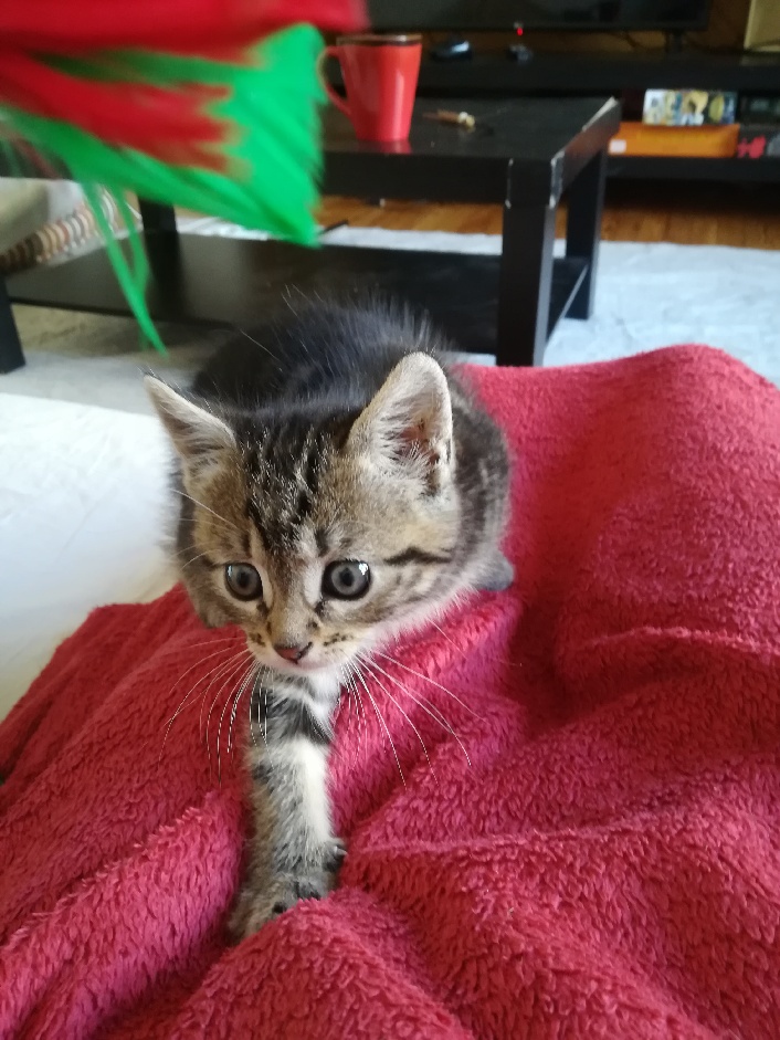Une fois que vous l’avez ? Vous découvrirez un chat joueur et curieux, pro de la chasse aux boulettes de papier et de l’attaque acrobatique de fil, qui vous émerveillera de moult mouvements d’art martiaux de sa création. Une fois fatigué de ses prouesses, il aime dormir contre les jambes bien au chaud sur le lit. Il vient de découvrir le bonheur des caresses et s’y habitue encore (il faut y aller doucement et lui laisser le temps) mais en demande de plus en plus!